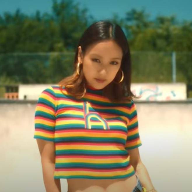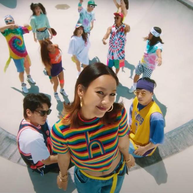'다시 여기 바닷가' 뮤직비디오에서 보여준 린다G, 이효리의 스타일링은? H 로고가 새겨진 컬러풀한 스트라이프 패턴의 톱과 데님 팬츠, 링 귀고리를 착용해 90년대 무드를 완벽히 재현했다.