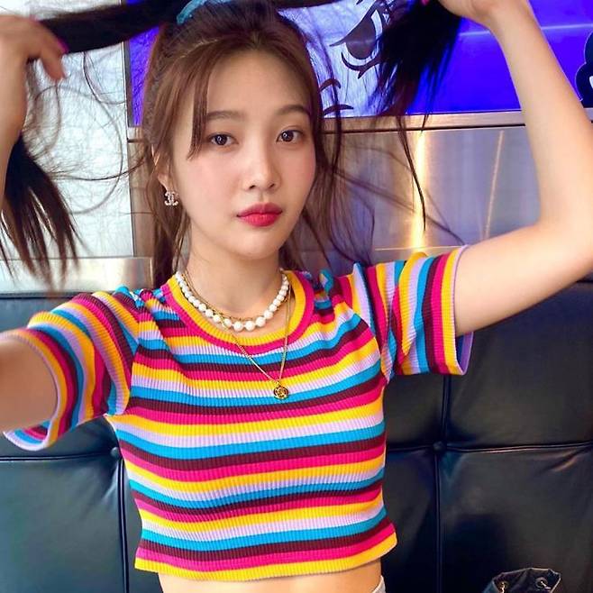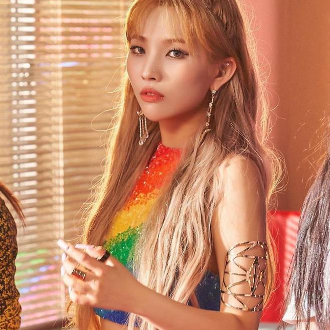 신곡 '덤디덤디'로 돌아온 (여자)아이들. 기존의 다크하고 강한 이미지에서 벗어나 청량한 서머 곡으로 색다른 변신을 시도했다. 지금까지 블랙이나 레드 컬러로 절제된 스타일을 보여줬다면, 이번 컴백에서는 화려한 컬러의 스타일링을 선보인 것. 특히 소연은 선명한 무지개 컬러의 크롭트 톱에 볼드 한 주얼리를 매치해 펑키한 무드의 트로피컬 룩을 완성했다.