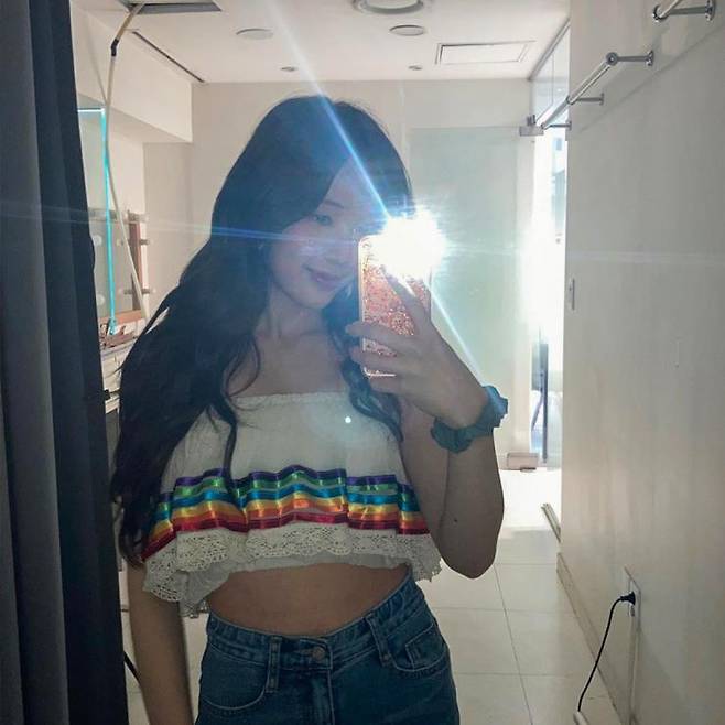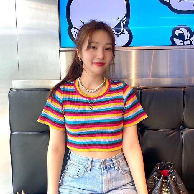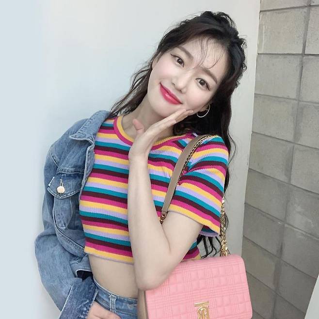 통통 튀는 컬러를 상큼하게 소화한 이유비. 분더캄머준의 레인보우 크롭트 톱에 청재킷과 핑크 백을 매치해 컬러 매치의 진수를 보여준다.