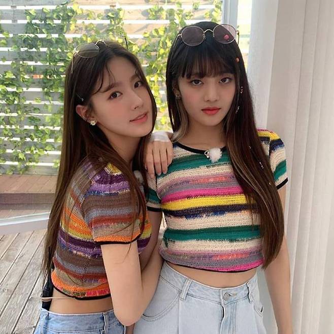 트윈 룩을 센스 있게 연출하고 싶다면? (여자)아이들의 미연과 민니처럼 동일한 디자인에 컬러감이 다른 톱을 입어보자. 대신 데님 컬러나 주얼리 아이템에 변화를 주는 게 포인트. 경쾌한 포즈까지 지어 보인다면 상큼 지수 Up!