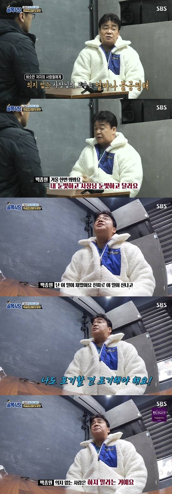 백종원은 "나도 포기할 건 포기해야 한다. 지식과 경험이 없는 건 괜찮다. 열정 없는 사람을 왜 끌고 가야 하냐. 백종원은 평소에 자영업 많다고 하지 말라면서 의지가 없는 사람 끌고 가냐고 할 거다"라고 했다. 백종원은 "다른 곳에 취업해서 월급 200만 원을 받을 수 있고, 이 식당에선 더 일하고 50만 원도 못 받는다. 그래도 이 일을 할 거냐"라며 의지를 확인했다.