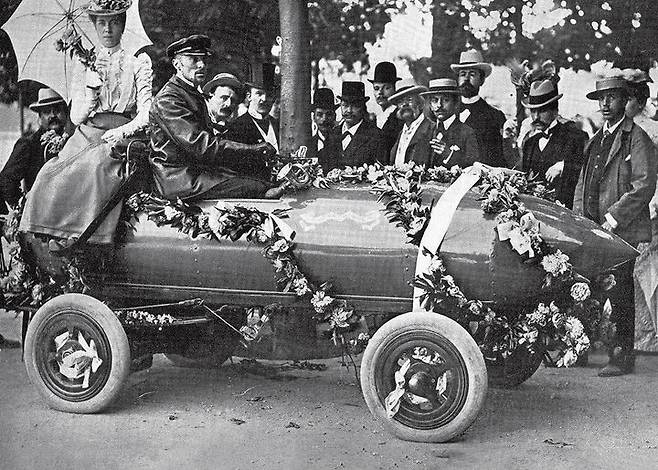 사실 이 시기 전기자동차도 만들어졌는데요. 1899년 3월 29일 벨기에의 레이서 카밀 제넷지는 전기차를 타고 시속 100㎞의 기록을 달성하기도 했어요. 마치 로켓처럼 생긴 ‘제니스 콘텐티(La Jamais Contente)’라는 차였죠. 토머스 에디슨 역시 1913년에 전기차와 찍은 사진이 있어요. 미국의 각 지역에는 자동차 충전소가 세워져 전기자동차의 시대를 실감케 했습니다.