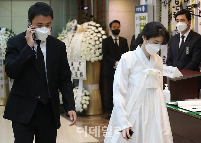 [이데일리 이영훈 기자] 홍정환-서민정 부부가 28일 서울 종로구 서울대학교병원 장례식장에 마련된 고(故) 신춘호 농심 회장의 빈소에서 이동하고 있다.
