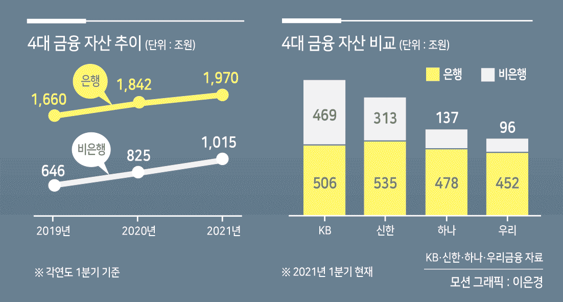 3월 말 기준 은행 자산은 1970조원으로, 전년 같은 기간 대비 7.0%(129조원) 증가해 2000조원에 근접했다. 비은행 자산은 1015조원으로, 전년 동기 대비 23.1%(191조원) 늘어 증가폭과 증가율 모두 은행을 크게 웃돌았다. 비은행 부문의 약진으로 4대 금융 내에서 비은행 자산이 차지하는 비중은 올 34.0%까지 올라왔다. 불과 2년 전인 2019년 1분기(28.0%)만 해도 30%가 채 되지 않았다.