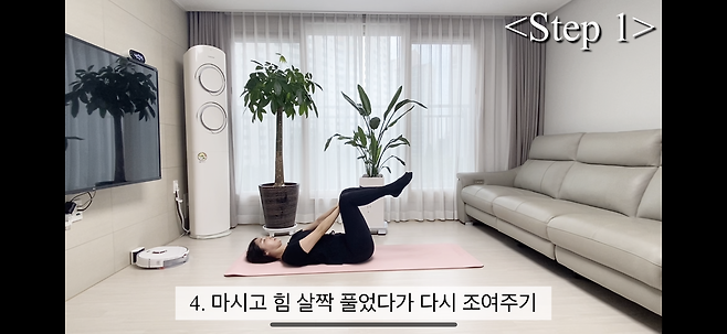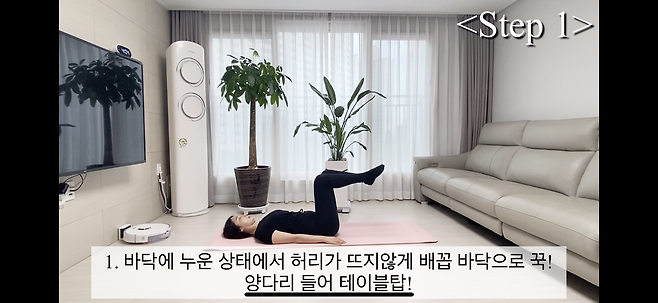 1. 바닥에 누운 상태에서 허리가 뜨지 않게 배꼽 바닥으로 꾹! 양다리 들어 테이블탑!