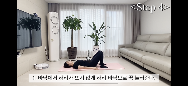 1. 바닥에서 허리가 뜨지 않게 허리 바닥으로 꾹 눌러준다.