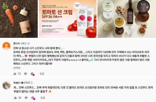 '토마토 톤업 선크림'은 국민 아이템으로 불렸는데, 단종됐다 지난해 고객 요청으로 재출시 됐다. 그 외에도 블랙슈가 퍼펙트 에센셜 스크럽 등이 인기를 끌면서 스킨푸드는 2010년대 국내 로드숍 화장품 시장에서 3위를 차지할 정도로 성장했다. 2012년엔 매출 약 1800억 원, 영업이익 100억여 원을 기록했다.