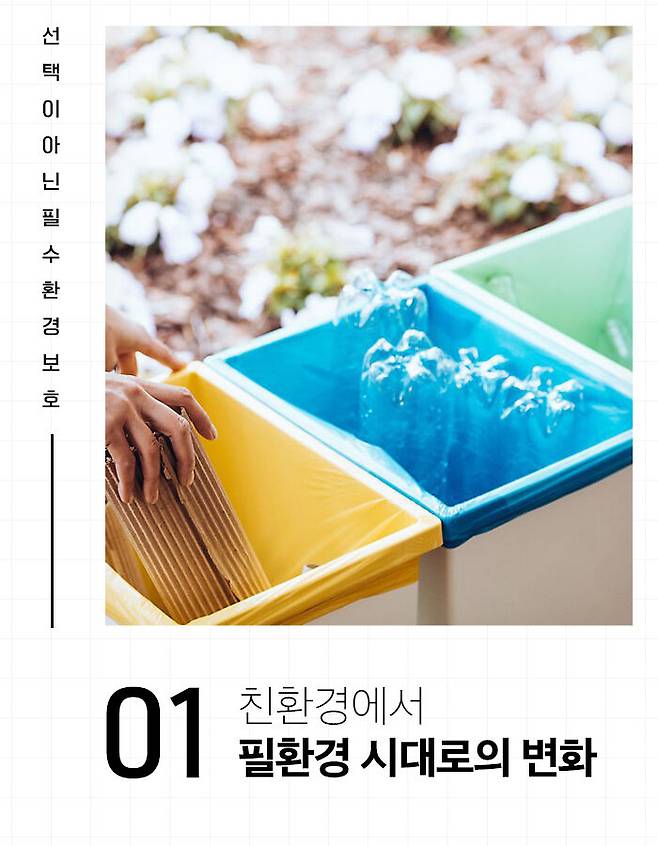 '필환경'이라는 말, 들어보셨나요? '반드시'를 뜻하는 한자 '필'과 환경이 합쳐진 단어인데요. 그동안 환경을 생각하는 소비가 그저 하면 좋은 일이었다면, 이제는 살아남기 위해서 반드시 선택해야 한다는 개념을 뜻합니다.