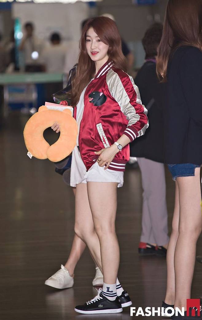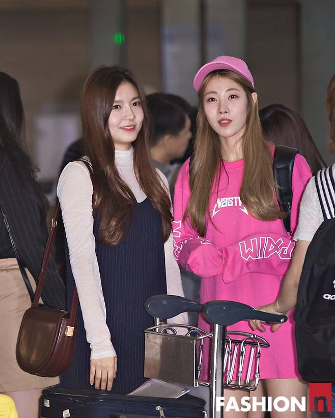 세정은 화이트와 인디코 컬러의 배색이 멋스러운 스커트와 스트라이프 블라우스를 착용해 캐주얼하면서도 스타일리시한 모습을 선보여 눈길을 끌었으며 미나는 블랙 컬러의 레더 스커트와 화이트 블라우스에 블랙 미니백, 블랙 구두를 매치해 블랙&화이트 컬러의 시크한 공항패션을 완성했다.