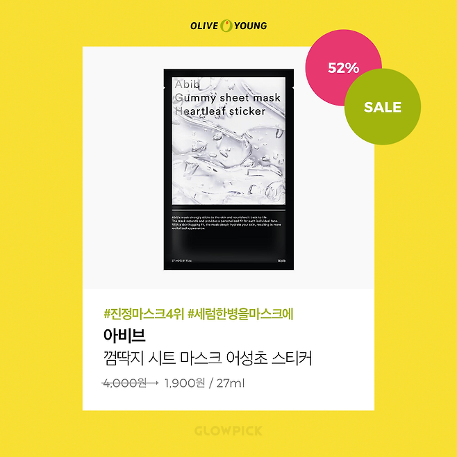 ** 아비브 껌딱지 시트 마스크 어성초 스티커 4,000원 -> 1,900원 (52% SALE) **