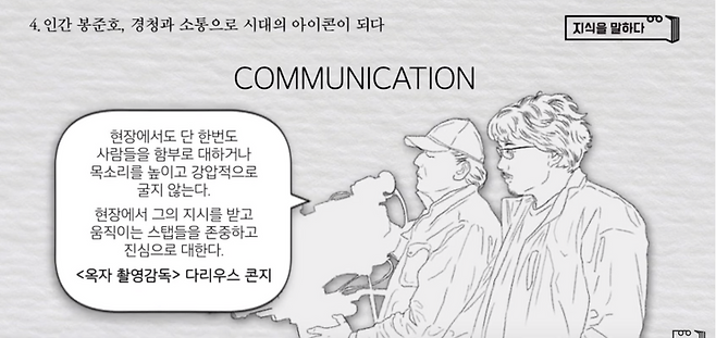 커뮤니케이션이라는 단어가 참 잘 어울린다는 봉준호 감독은 촬영현장에서 스태프들의 말에 귀를 잘 기울이는 감독으로 유명합니다. 작은 소리 하나 경청하고 소통하면서 제작을 하는데, 시너지 효과를 일으켜 더 좋은 작품이 만들어 질 수 밖에 없다고 영화인들은 입을 모아 얘기하죠.