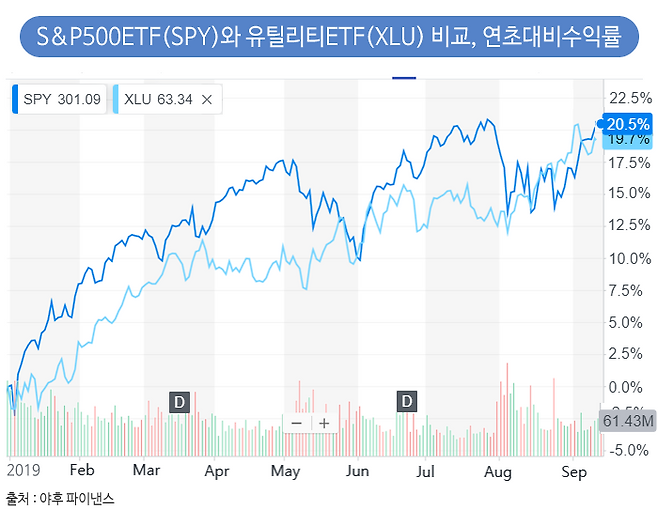 위 자료의 파란색 차트는 S&P500을 추종하는 대표 ETF인 SPY이며, 하늘색은 유틸리티 ETF인 XLU의 연초 이후 주가 흐름을 비교한 자료다.