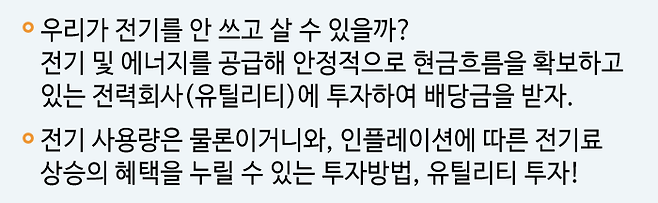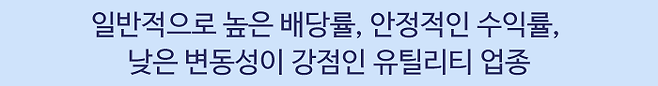유틸리티 회사들은 전력, 수도, 가스 등의 생활 필수적인 에너지를 공급하기 때문에 기본적인 수요가 뒷받침된다. 게다가 대규모 장치산업으로 신규 업자들의 진입이 어려워 진입장벽도 높은 편이다.