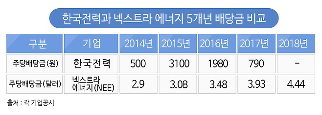 위 자료는 한국과 미국의 대표 유틸리티 기업인 한국전력과 넥스트에라 에너지(NEE)의 5개년 주당배당금 내역을 비교한 표이다.