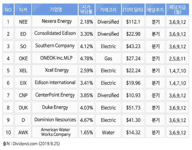 아래 자료는 시가총액 10억 달러 이상(원화 10조 원 이상), 배당을 5년 이상 증액한 유틸리티 상위 기업 10개를 정리한 표다.