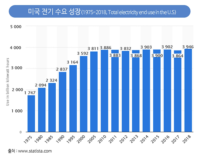 위 자료는 미국 내수 전기 수요를 1975년부터 2018년까지 나타낸 그래프인데 2010년대 들어 전기 총수요는 정체된 것처럼 보이나 꾸준한 요금 인상, 유가 안정 등의 대응과 외부환경으로 유틸리티 기업들은 꾸준히 이익을 창출해왔다.
