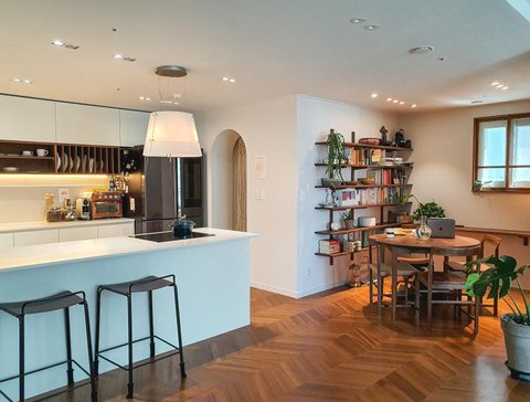ㄷ자의 대면형 주방으로 변경 후 아이들이 주방에 머무는 시간과 가족이 같이 식사를 준비하는 시간이 늘었어요. 요리가 취미가 되고 소통의 장이 되며 편식이 심한 둘째의 식습관도 개선되고 있고요. 가족의 생일엔 이벤트로 같이 음식을 만들기도 해요. 엄마가 뭐하나 관심 갖는 아이들이 너무 귀엽답니다!