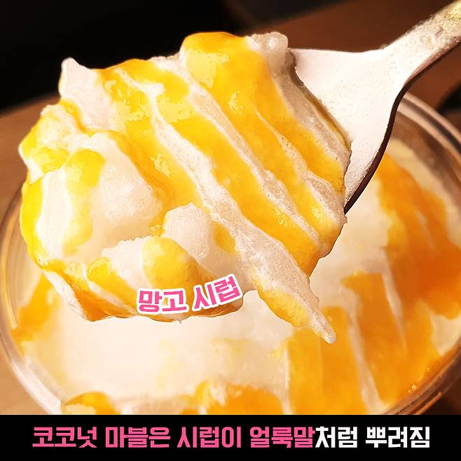 망고 시럽과 코코넛 슬러시? 걸쭉한 망고 스무디와는 다르게 사각 사각하게 갈린 코코넛 우유인데요, 코코넛 맛과 단맛이 세지 않아서 코코넛이 불호이신 분들도 거부감 없이 시원하게 드실 수 있을만한 맛이에요!