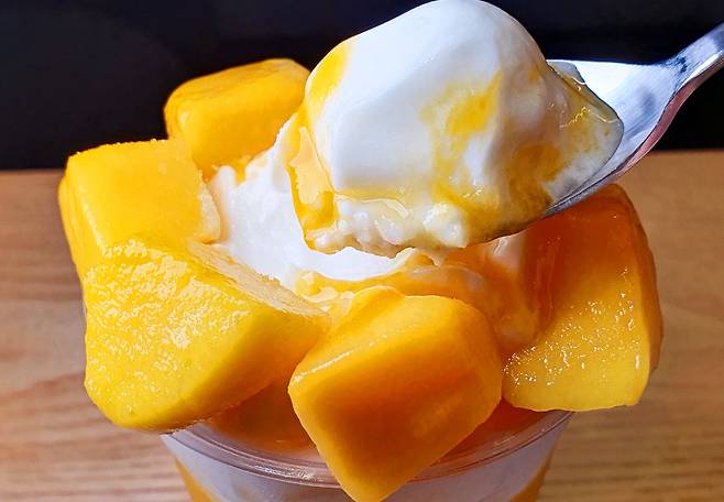 망고에 가려져서 아이스크림이 조금만 있는 줄 알았는데 계속 퍼먹어도 사라지지 않아서 당황ㅋㅋㅋ 소프트콘 한 개 양만큼은 들어가 있는 것 같아요.