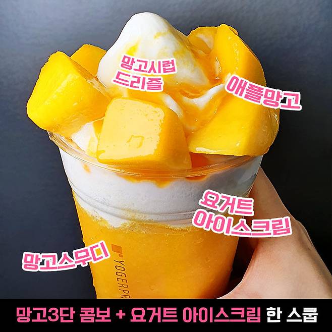 구성은 망고 스무디 + 애플망고 + 망고 시럽 망고 3형제와 요거트 아이스크림이 꽉 찬 한 스쿱 양 정도?들어가 있어요.