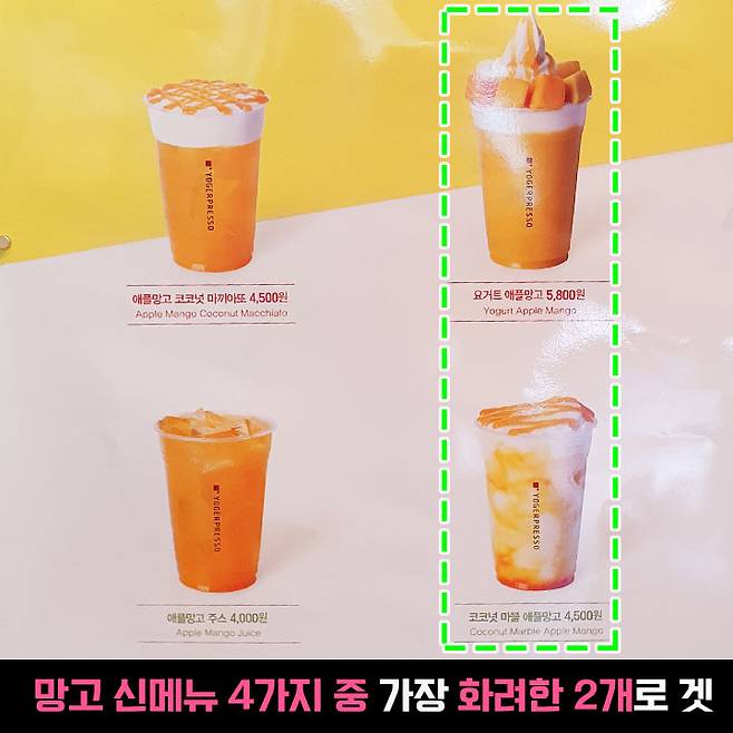 밥심은 친구와 두 가지를 골랐고요, 저기 푸짐해 보이는 요거트 애플망고는 5,800원이고 노란 마블이 있는 음료는 4,500원이에요.