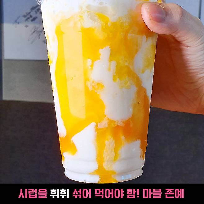 저는 섞어서 먹지 않고 아이스크림 먼저 떠서 먹은 후에 스무디를 마셨는데요, 스무디가 진짜 걸쭉해서 동남아 가서 사 먹은 그 맛이었어요ㅋㅋ 진심!! 이런 걸쭉한 망고 음료는 필리핀에서 처음 맛본 신세계였는데 한국에서도 가능하네요ㅋㅋ