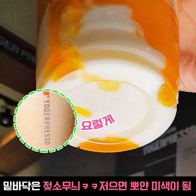 밑바닥도 흰 배경에 노란 얼룩이 젖소 무늬처럼 있네요. 요건 코코넛과 망고 맛을 함께 느끼기 위해 뽀얀 미색이 될 때까지 잘 저어서 먹었어요.