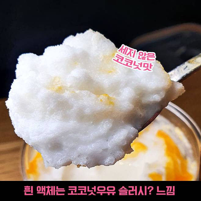 망고 시럽과 코코넛 슬러시? 걸쭉한 망고 스무디와는 다르게 사각 사각하게 갈린 코코넛 우유인데요, 코코넛 맛과 단맛이 세지 않아서 코코넛이 불호이신 분들도 거부감 없이 시원하게 드실 수 있을만한 맛이에요!