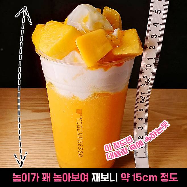 드디어 나온 음료! 요거트애플망고 는 토핑까지 포함하면 용량이 꽤 되어 보여서 높이를 재어보니 약 15cm 정도 되더라고요. 음료 컵 자체도 그란데 사이즈 컵이고 그 위에 토핑이 올라가있어서 대용량 축에 속하는 양이에요.