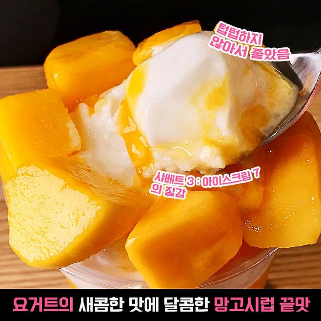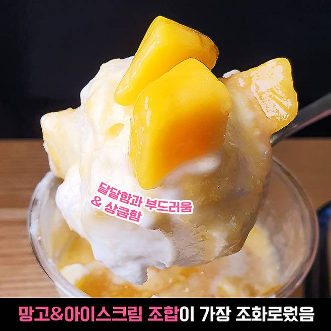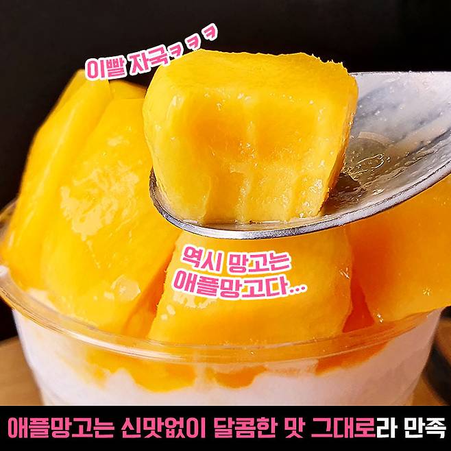 역시 망고는 애플망고가 최고인 것 같습니다... 신맛 하나 없이 달콤하고 이로도 슥슥 잘리는 식감까지... 크크 토핑 덩어리도 크고 넘넘 만족했어요. 사장님께 포크 요청드릴까 하다가 그냥 수저로 떠먹음ㅋㅋ