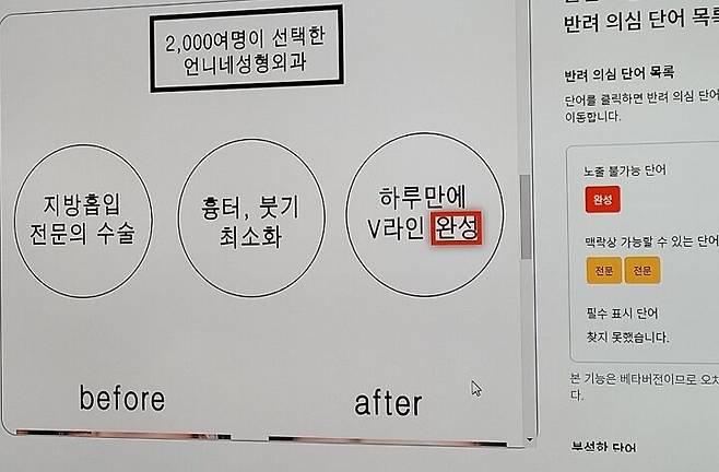 현재 법적으로는 의료 광고에 ‘지방흡입 전문의’ 라거나 ‘하루만에 완성’ 같은 표현은 쓰면 안 된다. ‘전문의’라는 말은 실제 학위를 받은 분야에 한해서만 달 수 있다. 하루만에 ‘완성’이라는 단정적 문구를 써선 안 된다. 보장할 수 없기 때문이다. 도자기 피부, 애플힙, 극세사 다리 처럼 성형을 조장하는 것 같은 모든 문구는 쓸 수 없다. 비포 앤 애프터 사진에는 실제로 언제 수술을 받았고 언제 재 촬영을 했는지 그 날짜를 써 줘야 한다. 운영팀은 매일 매일 쏟아지는 의료 광고를 살피고 이 중 법에 저촉되는 것이 있는지 여부를 판단하며 알고리즘 고도화에 기여한다. 자스민은 “강남언니에 대한 인지도가 올라오면서 리스크 관리도 중요해지고 있다”며 “이벤트 광고 제작 가이드를 만들고, 타이트하게 이를 지킬 수 있도록 병원에도 요구하고 있다”고 설명했다.