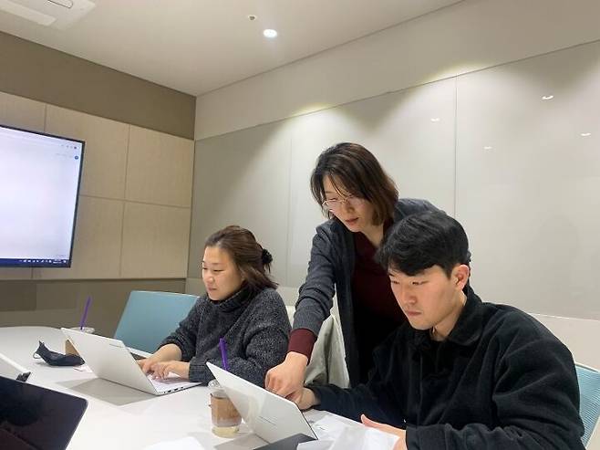 실제로 어떤 문구가 의료 광고에서는 불법인지, 그리고 알고리즘은 불법을 어떻게 잡아내는지 체험해 보기로 했다. 아래 사진은 검수 테스트에 돌입하기 전 따뜻하고 밝은 자스민 총괄(가운데)의 모습이다.