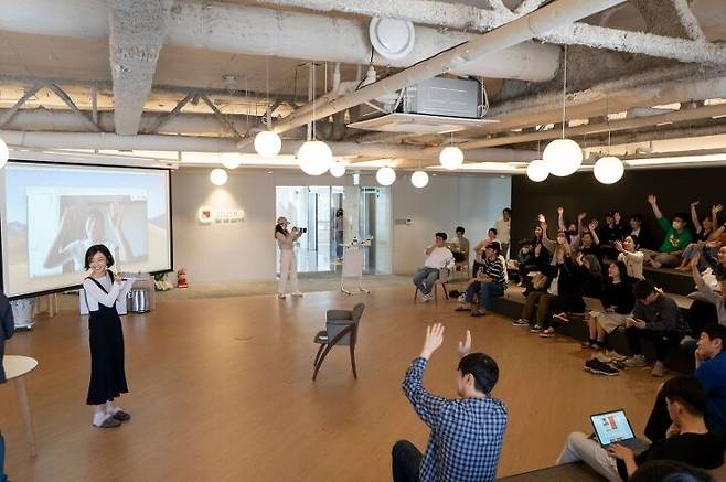 사진= 왜인지 나도 너무 흥분해서 환호하느라 다른 사람의 격정적 반응을 사진으로 찍지 못했다. 위의 사진은 다른 날의 타운홀 모습이다. 힐링페이퍼는 매주 수요일 오전, 타운홀을 진행하고 특정 안건에 대해 토론하거나 조직원 중 한 명이 자신을 더 친근하게 소개하는 시간을 가진다. 여든명이 넘는 직원이 모여 다른 동료의 얘기를 귀기울여 듣는 것은 인상적인 풍경이었다.