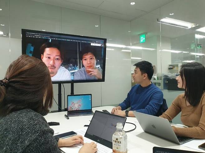 사진= 모니터 속의 두 남자가 알란과 마이크다. 화면을 보고 있는 이는 임현근 이사(브랜든)와 죠앤이다. 브랜든은 일본 법인을 총괄하는 역할을 한다.
