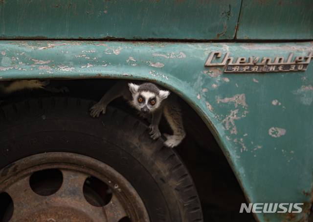 [산티아고=AP/뉴시스]15일(현지시간) 칠레 산티아고의 부인(Buin) 동물원에서 알락꼬리여우원숭이 한 마리가 폐트럭 앞바퀴 틈에 숨어 밖을 내다보고 있다. 코로나19 봉쇄 조치가 장기화하면서 심각한 재정난에 빠진 칠레 최대의 사설동물원이 유지비를 마련하기 위해 '동물 후원' 캠페인을 시작했다. 2021.06.16.