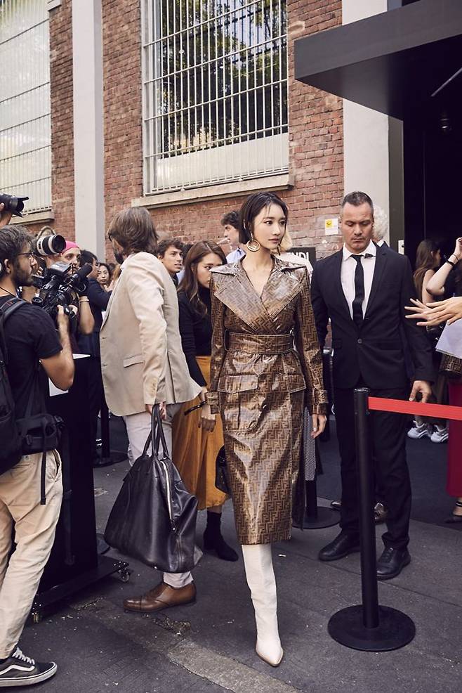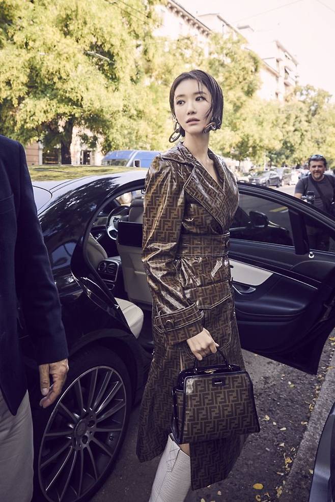 또 아우터와 같은 FF 로고가 전면에 들어간 미니백을 매치해 도시적인 매력을 더했고, 볼드한 귀걸이와 독특하게 컷아웃 된 힐이 멋스러운 카우보이 부츠로 마무리해 장소에 어울리는 화려한 무드까지 놓치지 않았다.