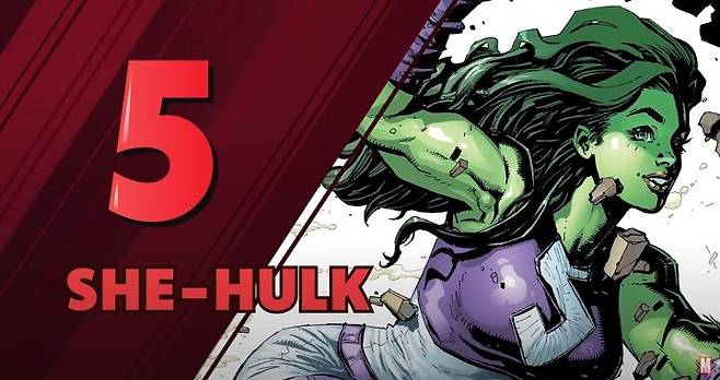 변호사 출신이라 그런지 헐크처럼 무조건 힘으로 밀어붙이기 보다는 자신의 능력을 잘 컨트롤해 보다 효율적으로 사용하곤 합니다. 힘과 지능을 모두 가진 완벽한 그녀이기에 어벤져스 뿐만 아니라 판타스틱4 멤버로도 활약했으며 슈퍼 히어로들을 교육시키고 관리하는 역할까지 훌륭하게 해냅니다. 모든 면에서 뛰어난 면모를 드러냈던 쉬 헐크. 어쩌면 더 높은 순위에 있어야 하지 않나 싶습니다.