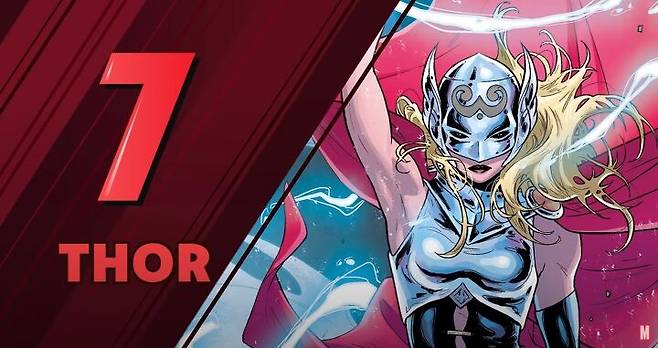 토르로 변신할 때마다 인간으로써의 육체는 더욱 더 약해진다는 사실을 뒤늦게 깨닫지만 그에 아랑곳하지 않고 강력한 적들과 맞서 계속 싸워 나갑니다. 결국 토르가 돌아온 뒤 그에게 망치를 넘기게 되고 그렇게 죽어가던 그녀를 토르는 되살립니다. 마블은 토르 못지않게 천둥의 신으로써 끝까지 그 본분을 다한 점을 높게 평가해 7위에 랭크 시킨 것 같습니다.