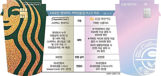 카드사들이 커피전문점과 손잡고 혜택을 대폭 강화한 카드를 잇따라 출시하고 있다. 특히 개인 신용카드 점유율에서 3위 자리를 다투는 KB국민카드와 현대카드가 커피전문점 브랜드를 전면에 내세운 PLCC(상업자 표시 신용카드)를 나란히 내놓으면서 눈길을 끌고 있다.