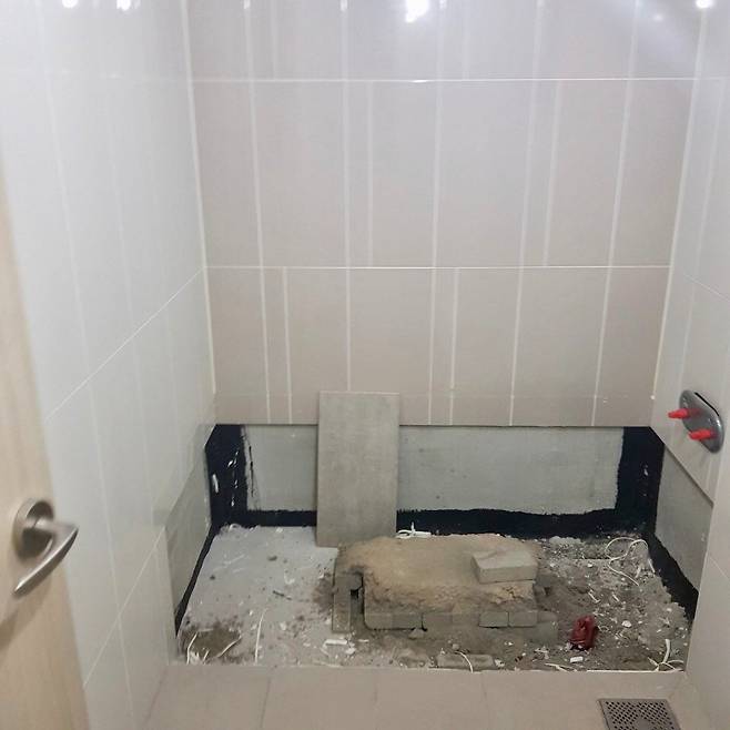 거실 쪽 욕실 시공 중에 찍은 사진이에요.