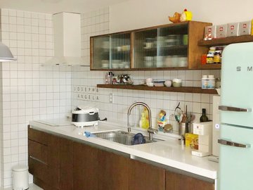 주방이 일자형으로 안쪽까지 쭉 뻗어 넓은 편이라 주방일을 할 때 굉장히 편해요. 수납공간도 많아서 그 점이 정말 좋아요.