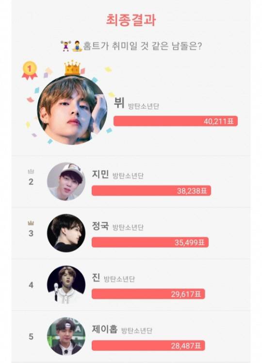 뷔는 투표에서 참여 인원 총 11만 3166 명 중 4만 211표를 얻어 1위에 올랐다.