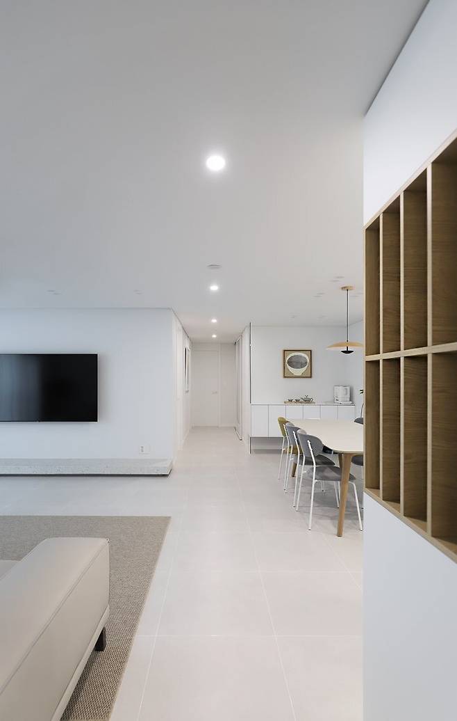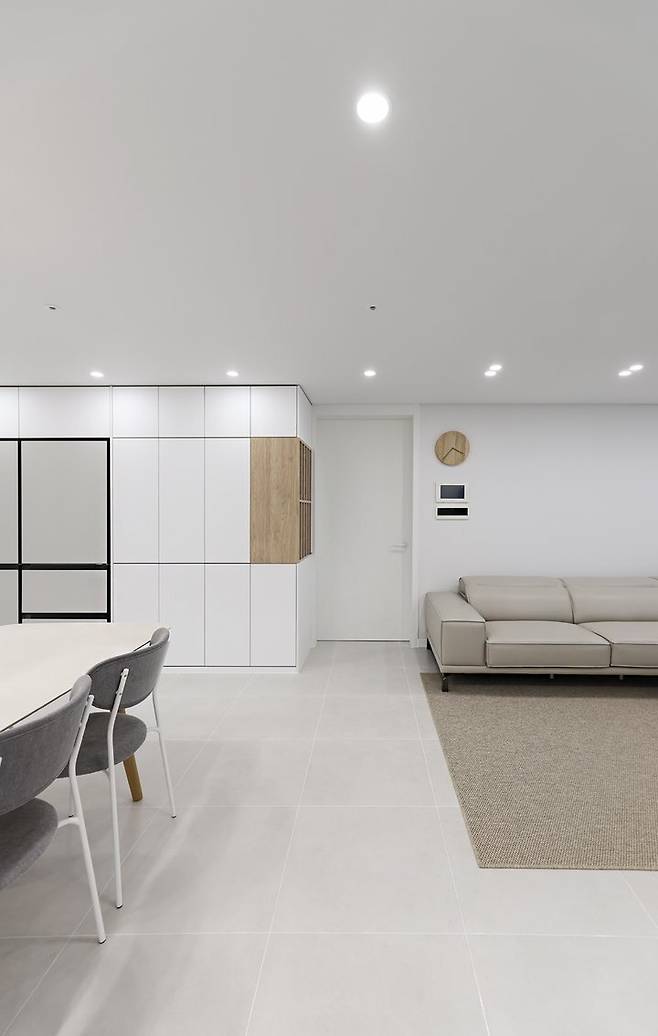 중문의 프레임 아래쪽을 살짝 올린 이유는 앞쪽의 다이닝 수납장과의 그리드를 고려한 점도 있지만, 현관 바닥의 신발들을 가려주는 기능적 역할도 있답니다. 현관과 거실의 타일을 공통으로 사용하여 시각적으로 더 넓어 보이는 효과를 주었어요.
