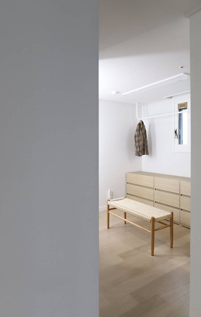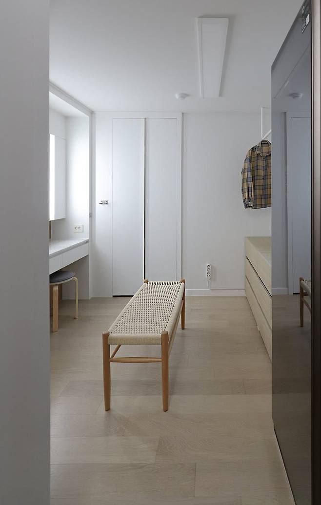 파우더룸과 드레스룸 사이. 계획된 공간으로 답답하지 않은 옷더미에 묻히지 않는 잠시 외투와 가방을 내려둘 수 있는 공간.