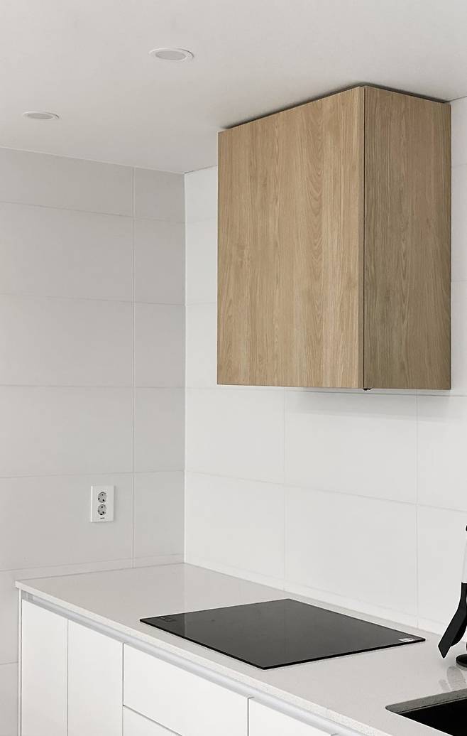 주방 정면을 공간의 확장성을 위해 상부장을 제거하였고 따스한 감성의 포인트 우드 후드 제작.