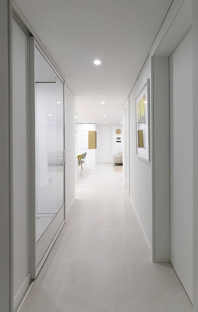 김점선 작가님의 노란붓꽃 그림이 맞이해주는 현관.