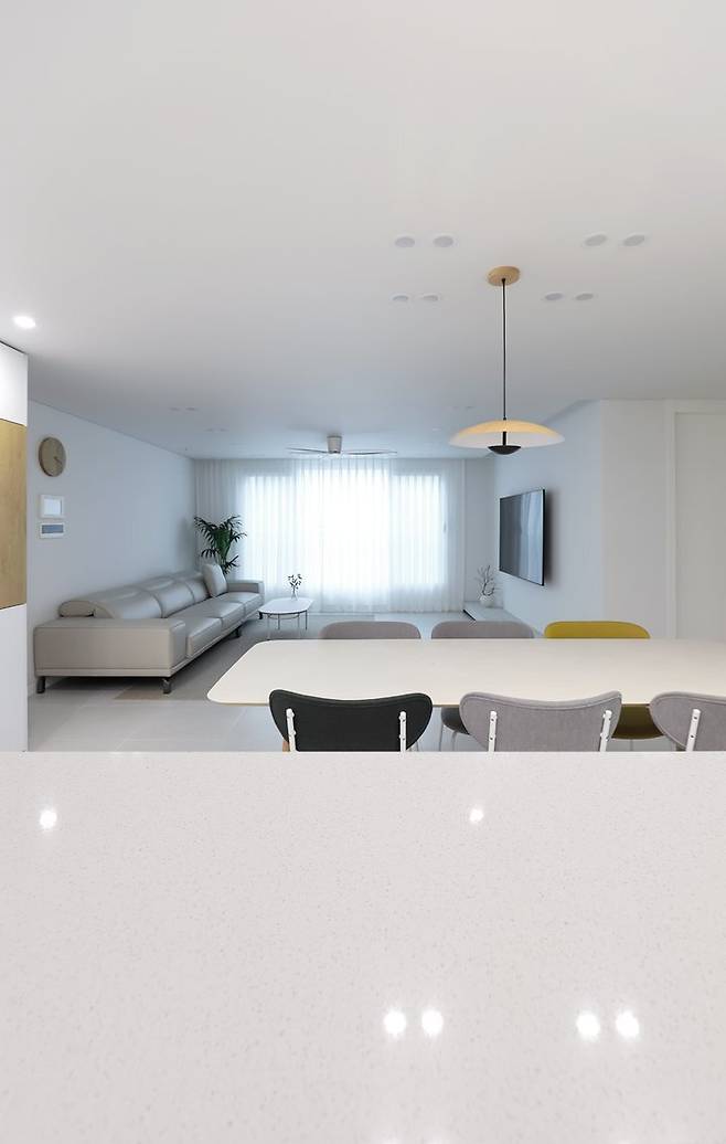 주방에서 바라본 거실. 엄마와 아빠가 요리할 때 아이가 다이닝 테이블에 앉아 재잘거리거나 거실에서 뛰어다니는 모습을 안전해게 바라다볼 수 있는 구조로 계획.