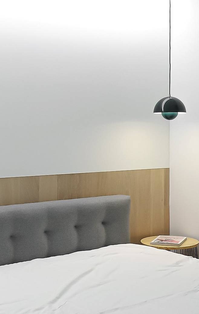 우드를 중심으로 화이트와 우드, 그레이의 3가지 소재와 컬러가 내추럴하고 편안하며 따스한 분위기를 연출.