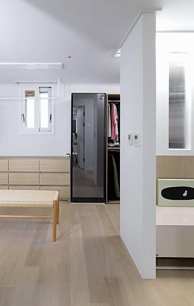 침실이 침대의 공간이라면 드레스룸과 파우더룸은 사용자가 활동을 해야 하는 공간이기에 자주 입는 옷과 앉아서 양말을 신거나 욕실에서 씻고 나왔을 때 공간 등을 계산하여 스마트한 공간을 계획.