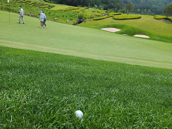 그린 주변 양잔디 에이프런/러프 사진입니다. 공이 반쯤 잠기는 모습을 볼 수 있지요. 관리 상태도 돋보입니다.